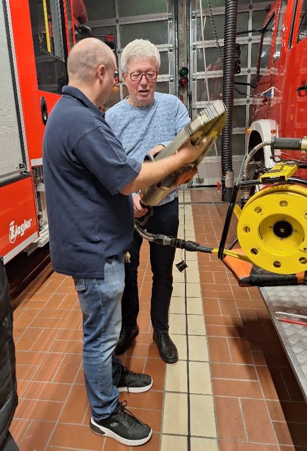 Helmuth Eistel mit einer hydraulischen SpreizzangeDer Besichtigungsrundgang: durch den Standort führte uns als erstes in die Baustelle der Kommando- und Alarmzentrale, hier bleibt in naher Zukunft noch einiges zu tun. Die Fahrzeughallen und die Werkstätten für Atemschutz und Schlauchwartung sind sicher ausgereift und vorbildlich. Wir konnten bestaunen wie vielfältig die Aufgaben und Anforderungen an unsere Feuerwehr doch sind und für jeden Einsatz gibt es an oder auf den Fahrzeugen eine Vielzahl von Hilfswerkzeugen.